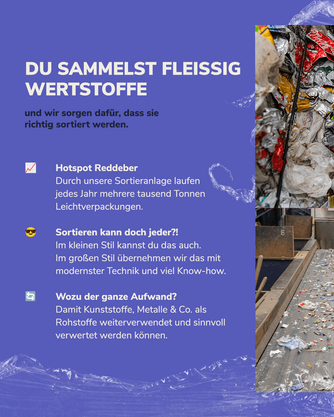 Du sammelst fleißig Wertstoffe, wir übernehmen den Rest: In unserer Sortieranlage in Reddeber laufen jedes Jahr mehrere tausend Tonnen Leichtverpackungen über das Band. 💪