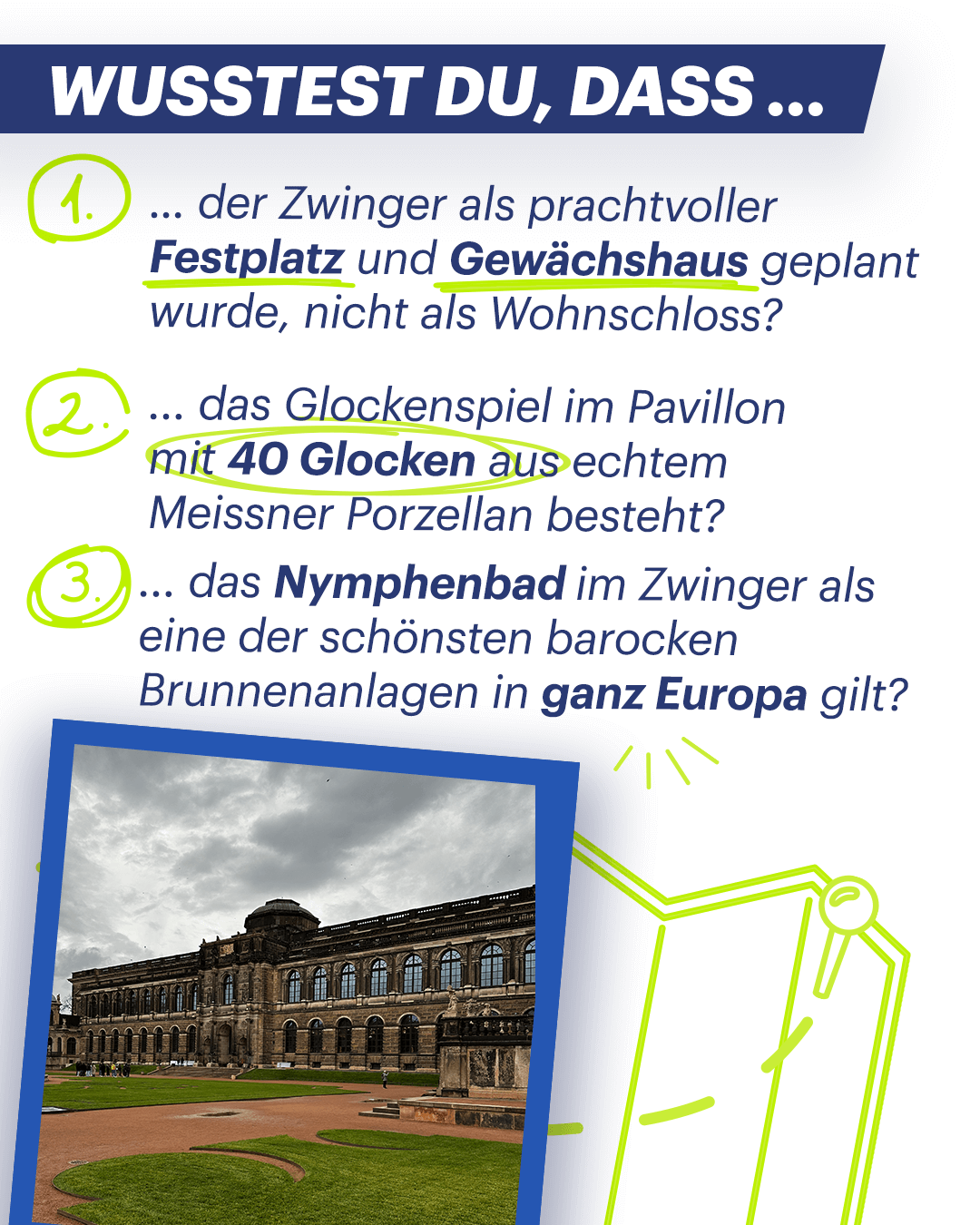 ▪️ der Zwinger ursprünglich als prunkvoller Festplatz und Gewächshaus geplant war, nicht als Wohnschloss?