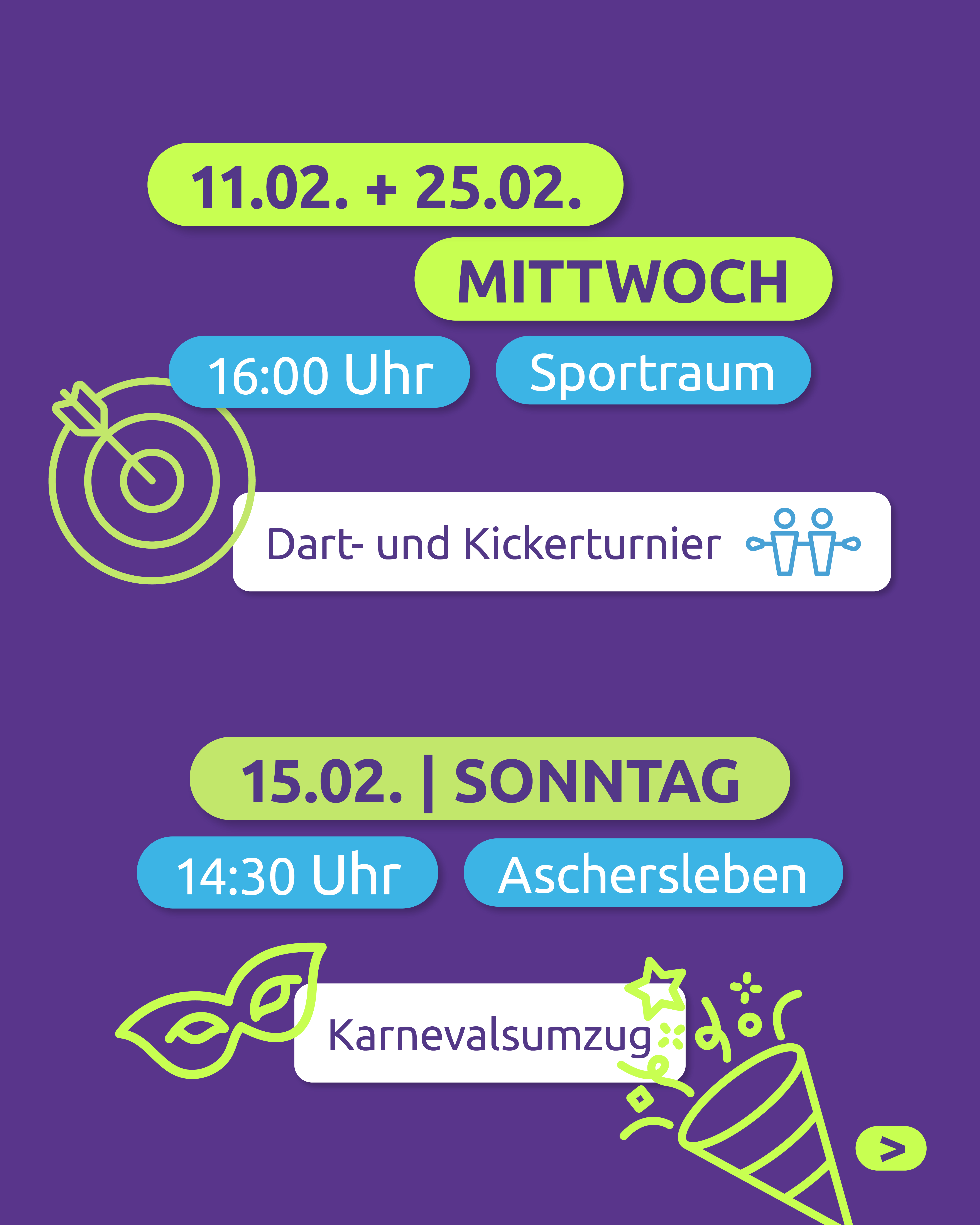 Freut euch auf ein abwechslungsreiches Programm mit Sport, Spiel, Kultur und Karneval – für jeden ist etwas dabei 💜💚